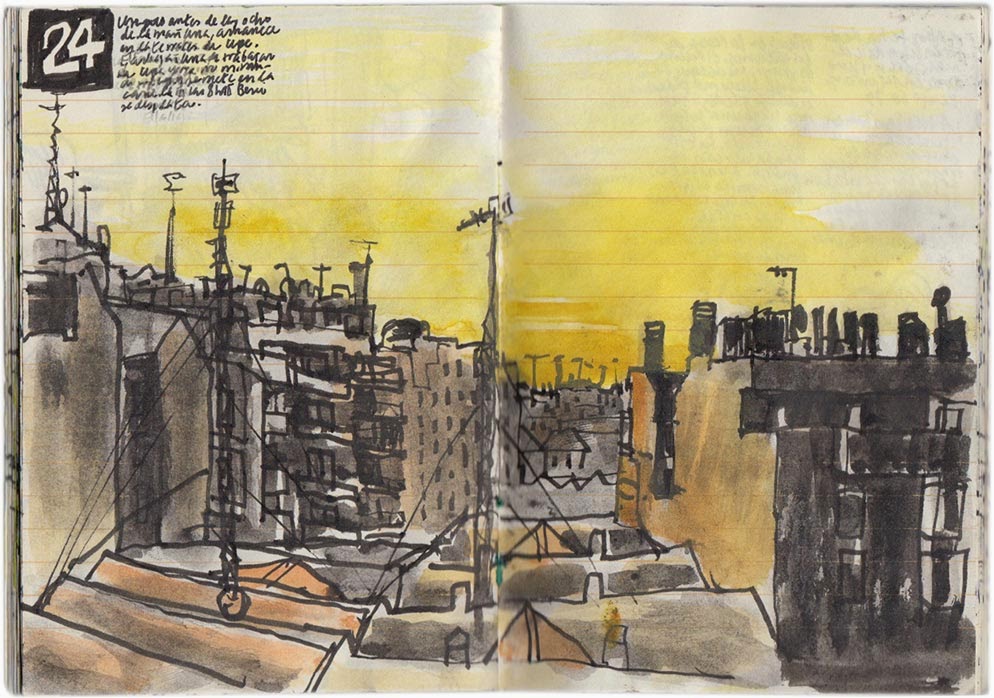 Son casi las ocho cuando amanece en Madrid pues el sol ha de saltar toda esa mole de hormigón y ladrillos que, de igual manera que rocas, montañas y árboles, cogen un color dorado, marrón, rojizo. El bosque de chimeneas y antenas no cobija ningún pájaro que empiece a piar, pero tenemos ese runrún del caucho sobre el asfalto y las sirenas que a Eliseo enloquecieron.