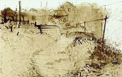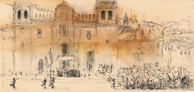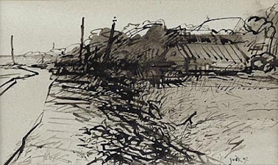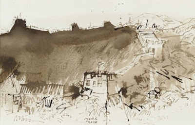 Aunque famoso por sus cuadros con una paleta de color tan clara que son casi blancos e inundados de luz, en sus temas el sol entra directo por una ventana y a veces se interpone un visillo, buscando ese pequeño tramo de luces y sombras iluminadas; a mí me gustan más su paisajes de tinta aguada, esos paisajes que hay que captar rápido en un viaje y llenan de sensacioness los cuadernos.