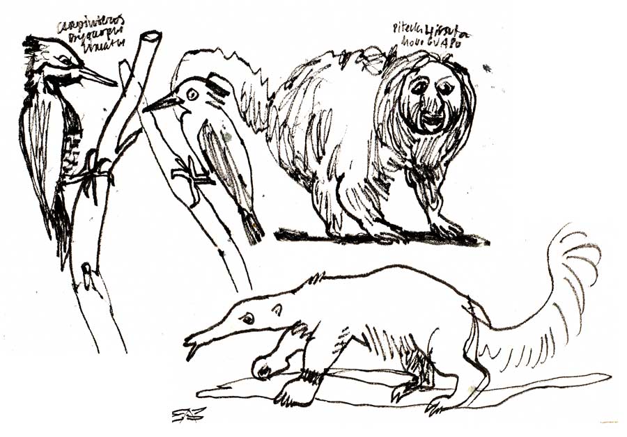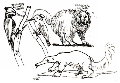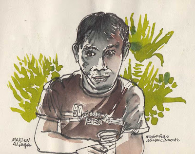 Vamos al Convento de franciscanos de Santa Rosa de Ocopa, muy cerca de Concepción, entre Jauja y Huancayo, tierra de alcachofas. Llegamos tarde, acaban de cerrar. Lo dibujo por fuera y, como quiera que los verdes se desparraman, construyo los edificios a partir de las manchas. A Marlon le gusta esto del dibujo y disfruta haciendo apreciaciones. Dibujo también el parque de Ocopa, sobre la misma base manchada en la vuelta de la hoja.