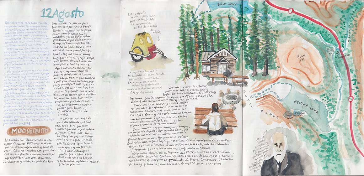Cenamos con el sonido del agua de las Athabasca Falls, junto al río. Al otro lado, dos oseznos. Intentamos dormir en el albergue cercano, que está a tope. Nos ponen unos colchones en el suelo de madera de una gran casa hecha de tablones y, en la casa de al lado, nos hacen los carnets de alberguistas. Es también de madera, pero más acogedora. En un espacio diáfano se reparten sofás, mesas grandes y pequeñas con butacas y sillas, un ping pong y una cocina con varias neveras. Hay una chimenea encendida. Para limpiarnos los dientes, nos enseñan a manejar un pozo artesano. Hay que apretar fuerte una palanca hasta que el agua sale, bien fría. En el oscuro casón, entran sonidos del bosque y el agua. Con este son, doblamos cansados.