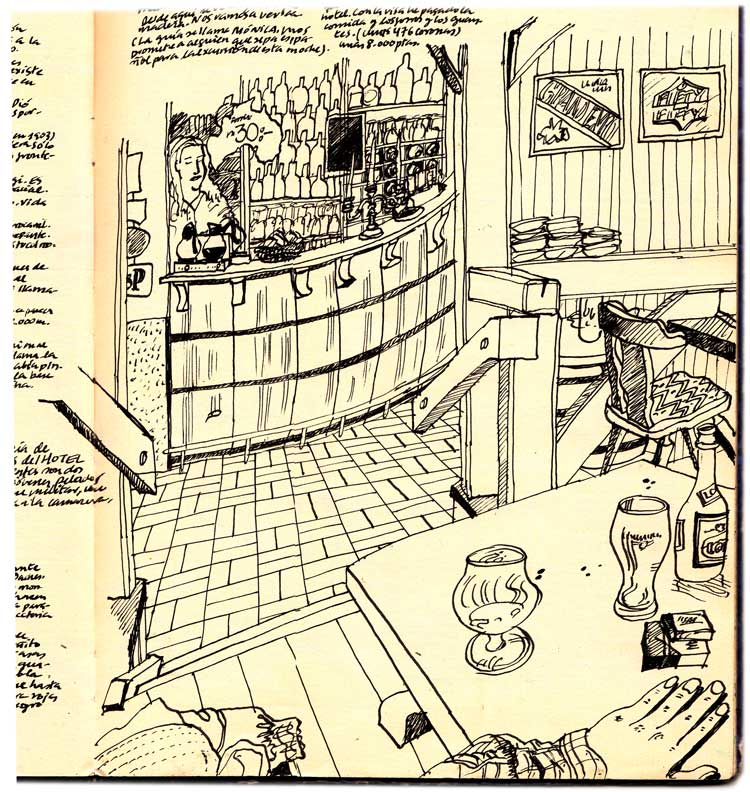 La guía, Mónica, llama a su amiga María, para hablar en español en la excursión de esta noche. Ella estuvo seis meses estudiando español en la Complutense. Nos dice que le encantó Toledo y también Segovia. El bar es tipo americano y la gente usa vaqueros y ropa americana. Me cobran 900 pesetas por un coñac y una cerveza sin alcohol.