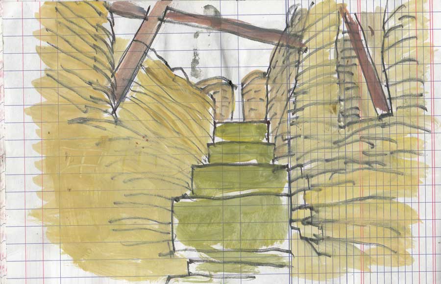 A la altura de la puerta dos, aparecen los tortolitos del Cusco, que acaban de llegar, exhaustos, después de seis horas de subida. También un chavalín que pasta aquí sus llamas. Ya no tengo material y saco las acuarelas, los colores que me quedan, y me pongo a dibujar, mientras Beni se pierde entre árboles y muros completamente alucinada. A veces grita ¡mira aquí! pues al adentrarnos entre los árboles la cosa se pone cada vez más interesante. Estamos excitados, como si de golpe la ciudad fuera a desaparecer. Beni quiere que lo dibuje todo, pero le ruego que se calme, que lo disfrute.