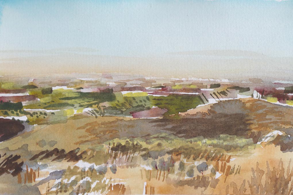 En La Solana visitamos la parroquia de Santa Catalina, con elementos de su construción en 1433, capillas y bóvedas de terceletes góticos, y todas las reformas del Renacimiento, destacando su torre. En la terraza del Chema nos tomamos unas cervezas, a la sombra, y dibujo la Plaza Mayor sacrificando la impresionante torre de la iglesia. El sol apreta y ya se sabe: más vale zorrera que tiritera.