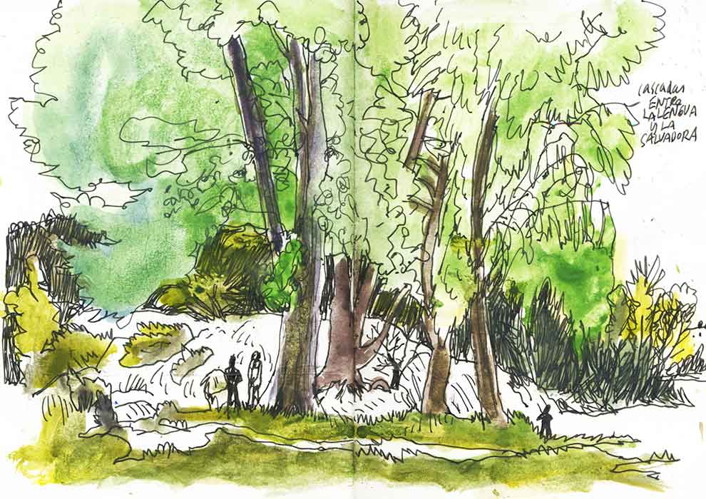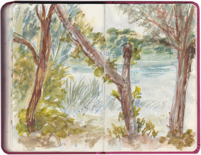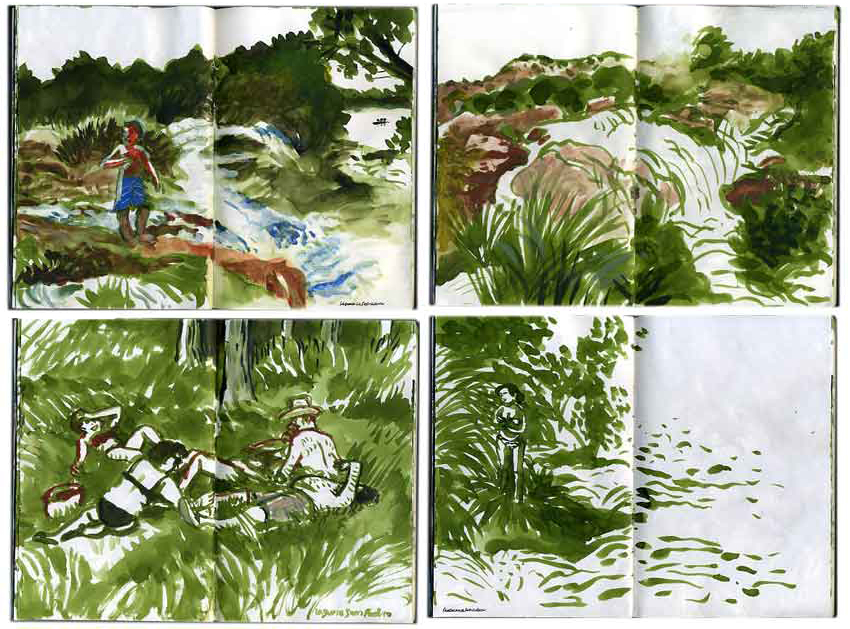 Durante algunos años, toda la familia, incluída la Miguela, pasamos muchos domingos en la playa privada de Entrelagos, en la Laguna Colgada; que entonces era capaz de recorrer de una orilla a otra y volver. Estos dibujos son de una excursión el 9 de Agosto de 2010.