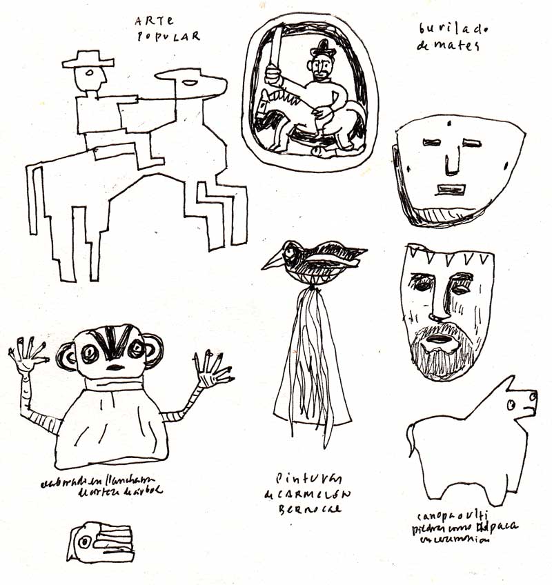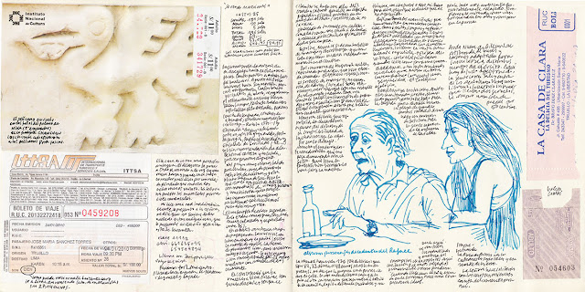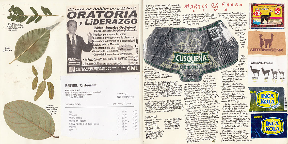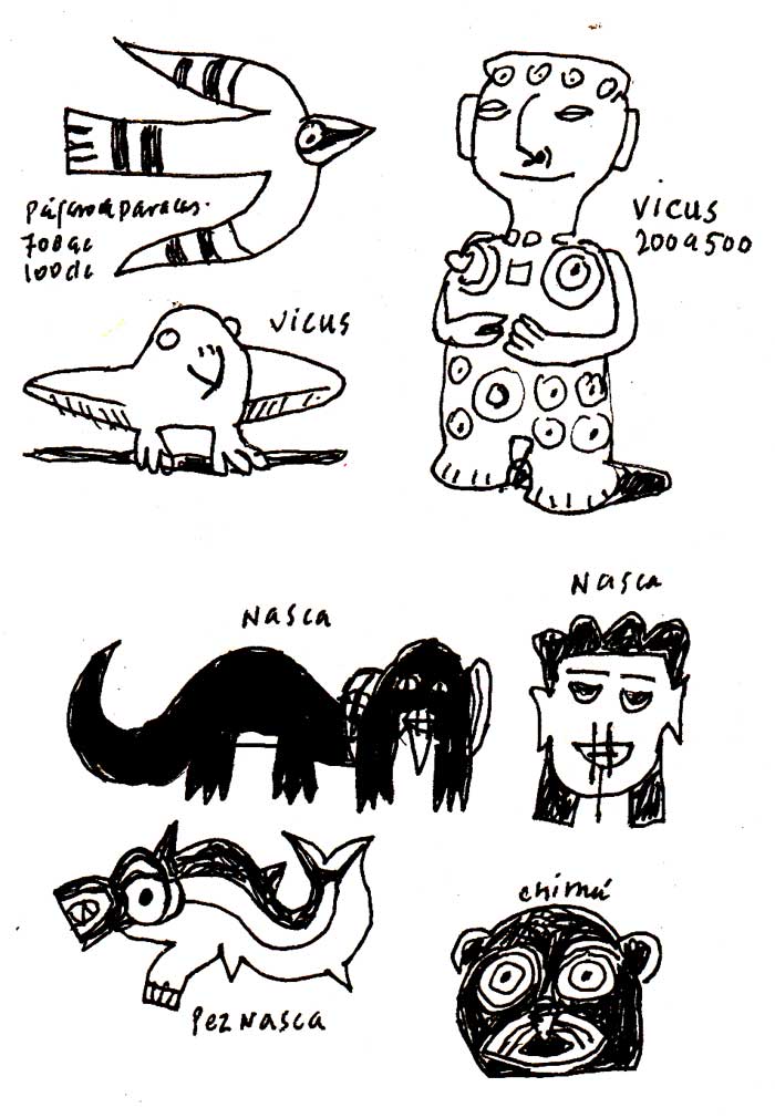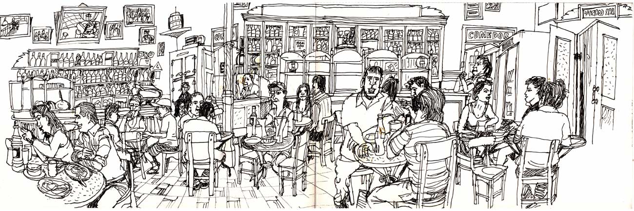 Ya en casa, trato de retener imágenes: el enano de rojo vendiendo helados, carteles pintados en los aparcaderos con la virgen sobre un carro, láminas escolares, chicas con los celulares metidos entre las tetas y los pobres limpiabotas limpiando esas largas botas de la policía de tránsito (supongo que por la cara). Voy a la taberna Queirolo (Quilca con Camaná), un verdadero descubrimiento. La dibujo. Es tanta mi felicidad que me llevo a Beni y nos apretamos un estofado de ternera a medias. Beni busca una alternativa de viaje a Cusco (no para de llover y están desalojando a los turistas con helicópteros).