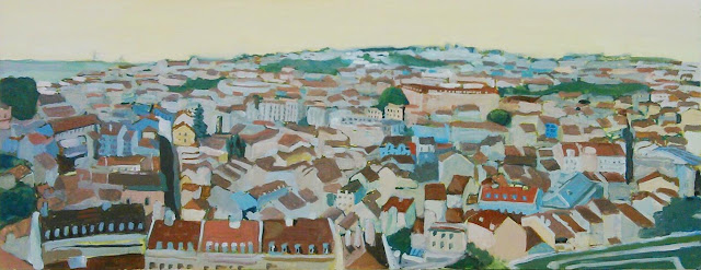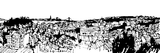 Lisboa tiene siete colinas desde donde asomarse a la ciudad. He aquí siete dibujos con siete vistas de Lisboa: Vistas desde el Mirador de Gracia hacia el Mirador del Monte, a la derecha, desde el Mirador del Monte, desde el Mirador de San Pedro de Alcántara (donde se ven los miradores del Monte, de Graça y del Castillo), Lisboa desde Cacilhas, vista desde el Mirador de Santa Catarina y vista hacia el río desde la terraza del Museo del Agua, en Amoreiras.