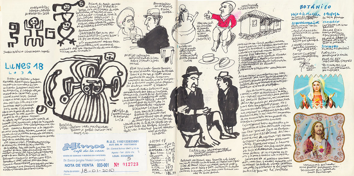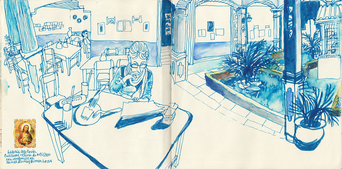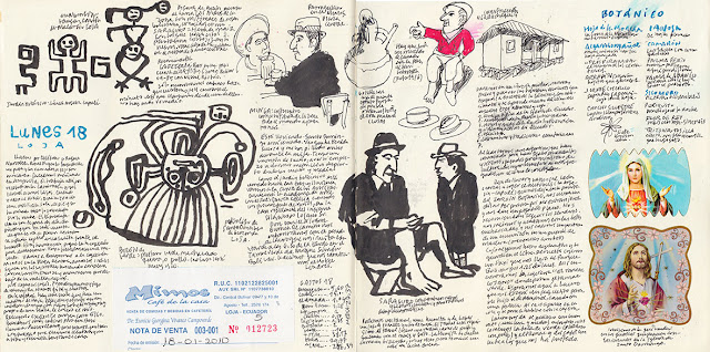 Nuestro redicho Lauro nos invita a un café en el Tamal Lojano con tamal de pollo y la bola de guineo verde (un plátano para cocinar). Nos dice que es el mejor sitio para merendar. Le hago un dibujo y me pregunta si no me molesta que diga que lo ha hecho él y que le haga una foto del dibujo para su hijo. Papeleo burocrático. Se va pronto. Nosotros nos vamos al hotel.