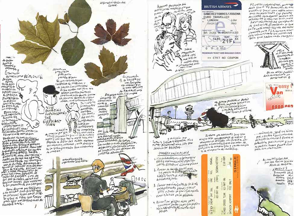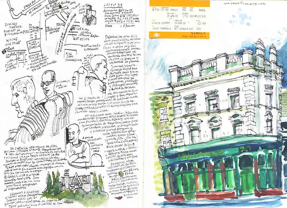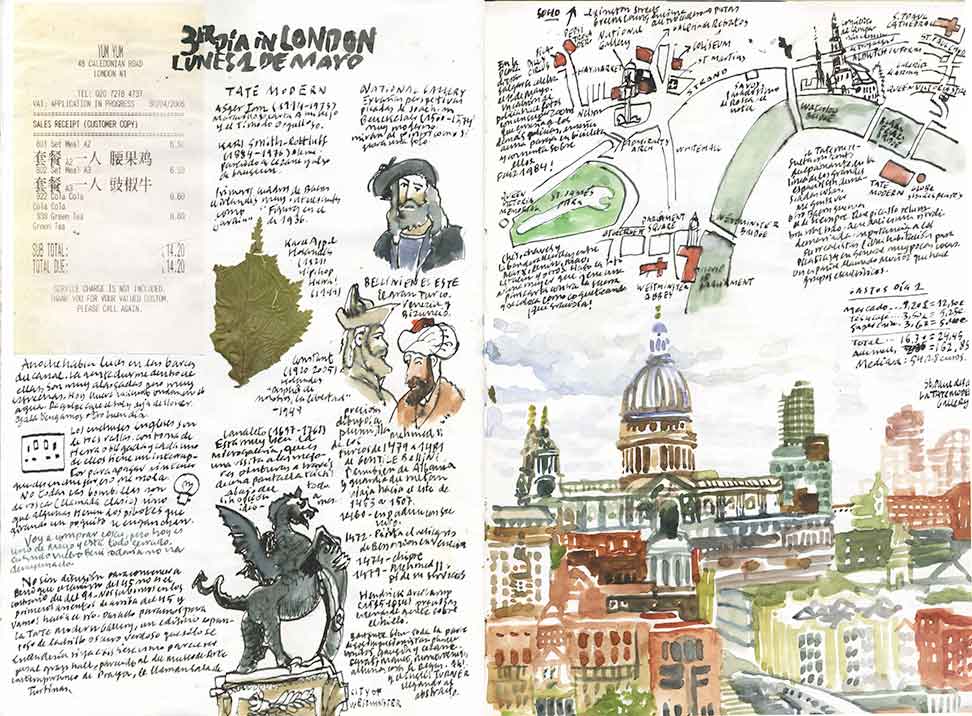 Subimos en el segundo piso del 45, hasta el río. Vamos a la Tate Modern Gallery, en un edificio industrial espantoso de ladrillos verdosos. El hall fue sala de turbinas y recuerda al del Museo de Arte Contemporáneo de Praga. Me decepciona, Picasso brilla entre todo, una habitación para Picabia y otra para los grupos ecultóricos de Muñoz. Cruzamos hasta la Catedral de San Pablo, Coliseum, St. Martins, la Galería de Retratos y la National Gallery, donde apunto los pintores de mi gusto. Hay Market, en Picadilly Circus la gente se hace fotos disfrazada, Trocadero, las putas hacia Lexington Street. Descansamos en los sillones-escenario de otro Café Nero con camareros españoles. Dibujo a la gente que se sienta y la que pasa por la calle.