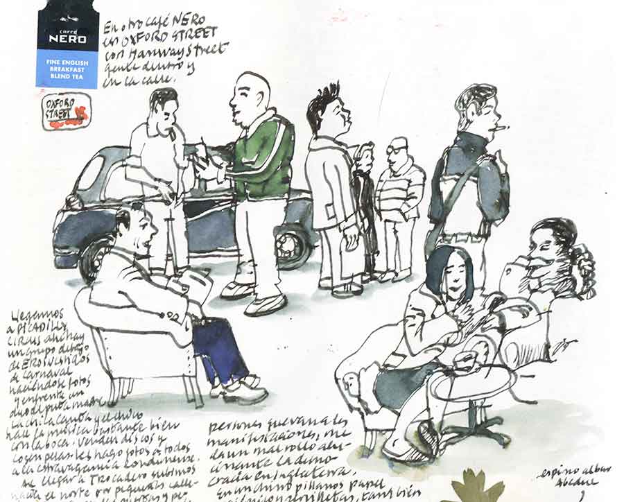 Hace frío. Nos tomamos un café italiano en una franquicia. El local es abierto, te sientas y la gente te ve y tú ves a los paseantes, así se ahorran pagar un espectáculo. Tienes que servirte tú mismo y te cuestan 600 pesetas, una maravilla. Amo Europa. Después de robarte en nueve cafés, te regalan el décimo. Por lo menos, me dibujo a unos clientes. Me canso de tanta cháchara de blanquita rubia con pecas.