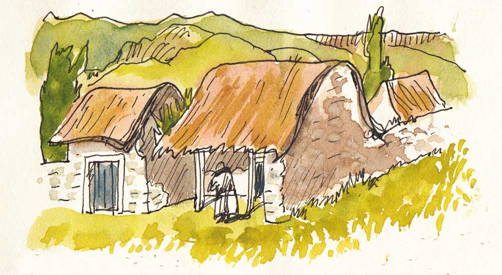 antiguas que aún se conservan, a dos aguas con hastiales altos, rollizos atados con tendones del cuello de la llama e itsu cubriendo, que cada vez se va haciendo más grueso con el tiempo pues hay que renovarlo. La iglesia está cerrada. Está completamente rehabilitada por el programa de la Aecid. La dibujo corriendo pues Renato está al llegar.