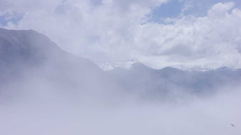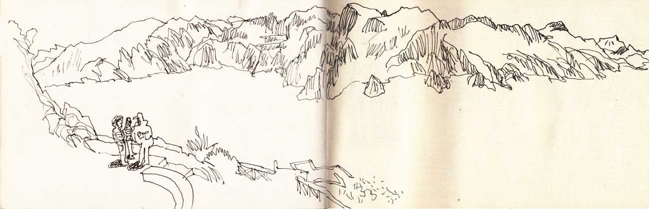 Hoy el río es una nube blanca y alargada que separa el mirador de las montañas, como un vacío relleno de algodón. No veremos el desfiladero, ni el río, pero esta imagen es alucinante. Rena fotografía sin piedad, él nunca ha visto este espectáculo. Este mar de algodón del que sobresalen los picos de las montañas. Hago un dibujillo rápido con Miguel, Beni y Renato en el mirador, sin color, con la esperanza de podérselo dar con las fotos. Nos vamos a la cita con el alcalde de Cabanaconde.