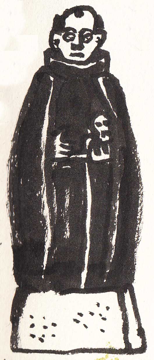 Su iglesia, que fuera de los franciscanos como todas las de la zona,es muy bonita, de piedra vista sin pintar. La fachada tiene dos torres blancas más elaboradas, con adornos vegetales. Su bóveda de cañón está agrietada y el pueblo espera la intervención de la agencia. Dentro celebran algo un grupo de mujeres con el gorrito cabana. Una de ellas lleva una jarra y fuera esperan los músicos. Los retablos son altarsitos de plastilina con muñecos enranciados. Al fondo a la derecha un retablo barroco muy impresionante. Aquí los muñequitos son de porcelana. Alguna foto del baile del waititi. Los hombres se disfrazan de mujeres con bonete circular de flecos sobre una máscara, extraño chaleco hecho de trozos de tela atada y falda levantada enseñando el refajo. En la fachada hay una escultura muy graciosa, un tanto naíf, de San Francisco. Mientras dibujo la iglesia, nos piden el boleto: Les decimos que somos de la agencia y que estamos documentando la iglesia con dibujos.