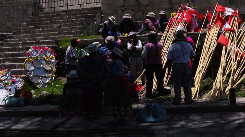 De vuelta, la niebla ha crecido en el mirador y ya no se ve nada, unas siluetas con gorrito cabana recogiendo los quioscos. Paramos en Maca. La iglesia es bonita con su galería de doble alto en la fachada para dar la misa fuera. Detrás, en la plaza, levantan la estructura de madera para el altar de la Candelaria, que se celebra mañana. Muchos palos largos con las banderas rojiblancas de Perú y mogollón de bandejas de acero inoxidable para rodear la carroza de la Virgen. La imagen es chula y colorista. Le pido a Rena que me haga alguna foto, mientras yo trato de guardar algún recuerdo tosco.