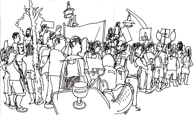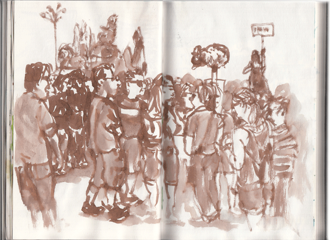 Los de la CNT sacan su A mayúscula sobre una gran bandera negra. Y los de Intereconomía se ponen a grabar mientras les gritan fuera, fuera. Hace calor y me siento en una terraza delante de una cerveza fresquita mientras se deciden a caminar. Dibujo algunos manifestantes. Los pulverizadores vuelven a funcionar. Veo que hay cierta uniformación en los tíos, que consiste en: gorrito de ala estrecha, gafas de pasta negras, camiseta negra ilustrada, pantalones debajo de la rodilla y zapatillas negras con calcetines cortos.