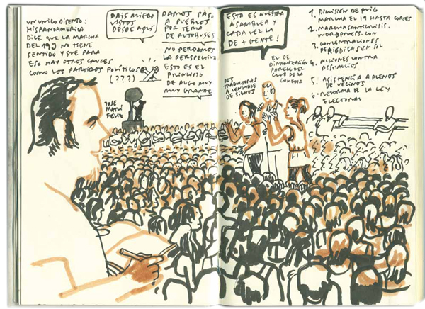 Hoy las asambleas son rápidas, efectivas. Dibujo la del Corredor del Henares y luego la General. La gente, sentada en el suelo, deja pasillos sin que nadie se lo pida, esto funciona. Todo el mundo se respeta, no hay agresiones. Se usa el llamado aplauso mudo, que consiste en levantar las manos y agitarlas. El moderador es un tío muy válido, muy efectivo. Lo agiliza todo y mete algunas morcillas para que el ánimo esté siempre arriba y la gente no se aburra. Un chaval lleva una camiseta amarilla con un texto bonito: por fin tenemos plaza en este pueblo. Sólo queda una pancarta: sabemos el camino de vuelta.