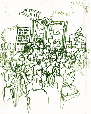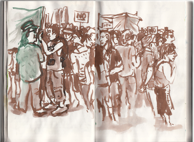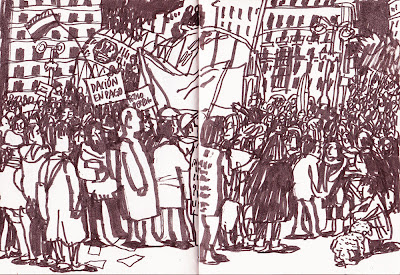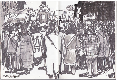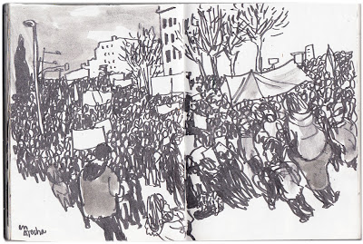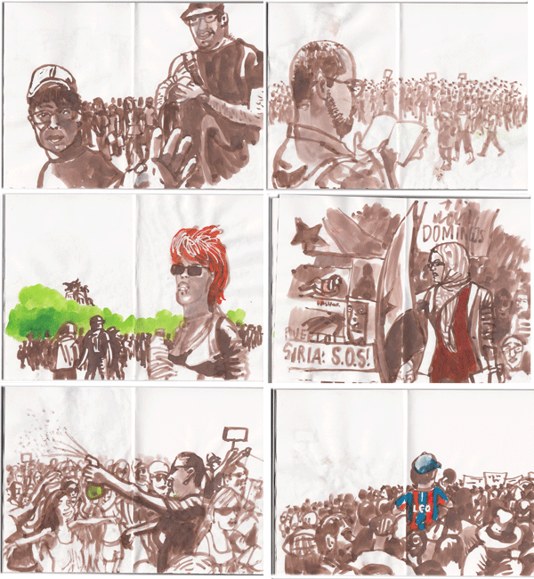 El domingo fue completito. Después de dibujar por el barrio, estuvimos en la mani. Fue emocionante cuando las columnas se unían. En las cabezas ponía de donde venían. Una especie de fragor que subía con los bombos y tambores. Entonces era una fiesta. La gente disfrutaba, a pesar del calor. Muchas gente echaba agua pulverizada. Ni un sólo partido ni organización. Cada uno llevaba su frase o consigna. Curiosas, graciosas, acertadas. Un gran chorizo esposado. Sólo banderas republicanas y sirias. Muchísima gente.