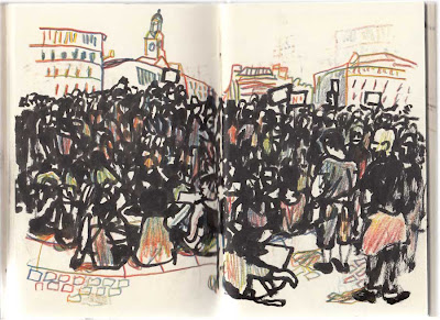 Pintan una grande que pone: Represión. Libertad de expresión, y se van todos detrás en manifestación. Nosotros nos quedamos con los remolones. Han puesto una placa metálica bajo el caballo: DORMÍAMOS. DESPERTAMOS. Plaza tomada. Eso pone. Alguien pone velas y no me gusta nada, le da un aspecto fúnebre. Me pasan cigarros y cervezas mientras dibujo a los porras. Se oyen los martillazos de los que hacen el punto de info. Quedan dos grupos de tiendas con algunos acampados que pretenden seguir. La asamblea propone que se vayan a otro sitio y que la Puerta del Sol, siga siendo un espacio asambleario.