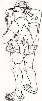 Subiendo Doctor Cortezo aparece un auténtico peregrino alto y fuerte que habla alemán, holandés o vaya usted a saber. Está quemado por el sol, lleva un pesado macuto y las zapatillas y los pies destrozados. Una chica trata de explicarle su equivocación, pero él no parece sentirse equivocado, sino bien. La chica saca una grabadora con un micrófono grande incorporado y le hace una entrevista mientras lo dibujo. ¡Cuánto me gustaría entender lo que dicen!