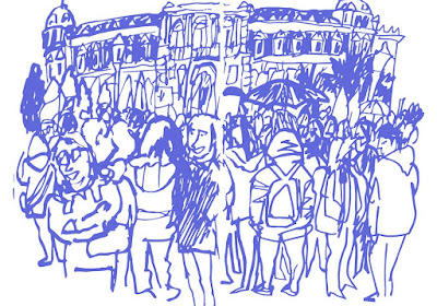 En contra de los sabios pareceres de los popes de la troika, los lisboetas cansados salieron a la rua para intentar abrirse la cincha un agujero al menos antes de morir asfixiados. En el dibujo suben la Plaza de Luís de Camôes.