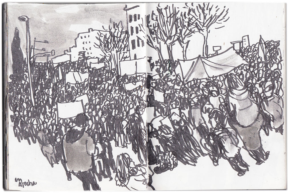 Mani divertida con mucha mucha mucha gente. Emotivo el encuentro con la columna del sur y luego en Atocha con los anarcos, y después el recuerdo de los abogados asesinados en Antón Martín. Froilán, sé bueno y dispara al abuelo, se oye. Cada uno lleva su pequeño cartel. No somos antisistema, ¡el sistema es antinosotros! se lee. Pocas banderas. Republicanas. Alguna griega. Viejos conocidos del 15M. El grito mudo a las doce. Sobre todo, mucha samba. Yo lo celebro con mi lápiz lisérgico y abandono cuando los riñones me lo exigen, demasiadas horas de pie.