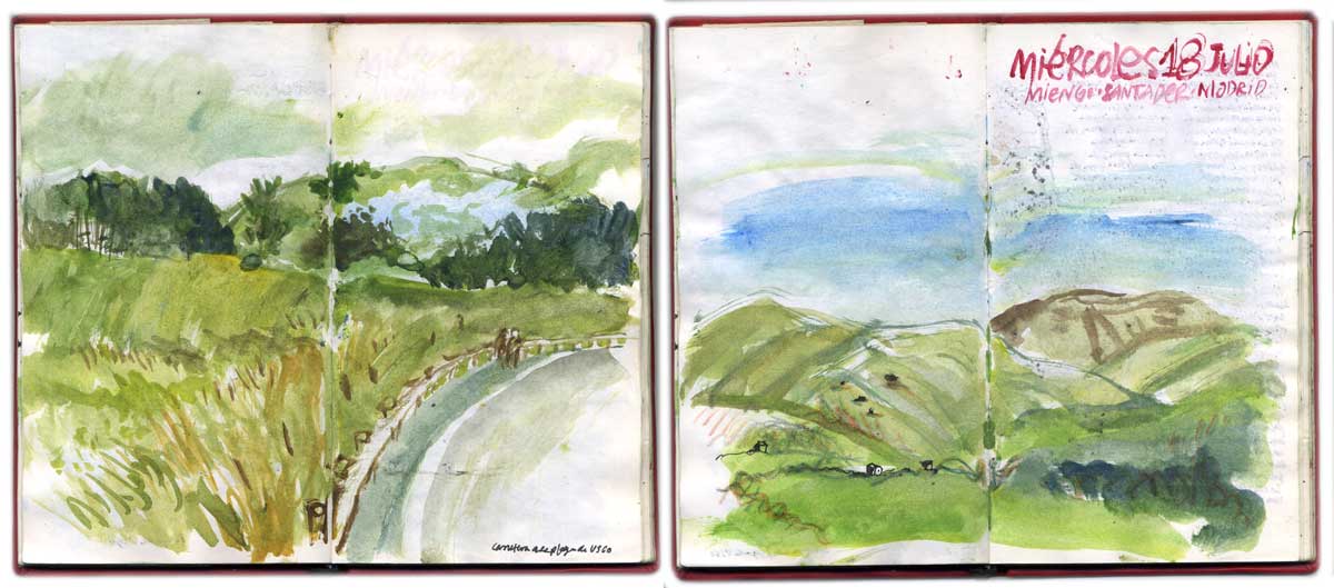 Paseo por encima de los acantilados, un bonito paisaje de hierba y rocas blanquecinas y agrietadas. Desde varios puntos veo la Playa de Usgo. Atravesando alambradas llego hasta los caballos y luego la carretera hasta los últimos meandros del Pas, Pueblo del Sol y la playa. Voy al bar del pueblo y me bebo una cerveza con queso. Sol pica las verduras y luego Mariano hace una sopa de papa rallada riquísima y los famosos filetes que querían quedarse en el curro. Recojo mis cosas y Mariano me lleva a la estación. En el camino hablamos despacio como si fuéramos otros y pudieran hacerse puentes en el abismo. Me duermo con el traqueteo en medio de la niebla y despierto sobre rastrojos amarillos y álamos verticales señalizando ríos y arroyos. Cuando salgo, alguien dejó la calefacción muy fuerte o nos están horneando.