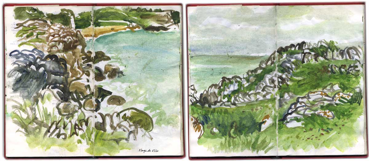 Amanece un día soleado de los que por aquí hay pocos. Cojo la bici de Mariano, me acerco a la Playa de los Caballos y me baño sin bañador para no escocerme con la bici. Subir otra vez cargado, dibujar desde arriba los puntitos que se mueven como hormigas y tumbarme en la hierba con un cigarro. Hay muchos bañistas, pero nada que ver con el Mediterráneo. Algunos se tuestan en el prado que hay delante de las canteras. Me cuesta la cuesta. Pero un rico sargo de la costa de Cantabria me espera y de Mariano y Sol la conversa con un rueda.