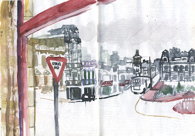 El hotel resultó ruidoso. Me levanto temprano. Dibujo el patio mientras la chica ve la tele sin volumen. María Luisa ha dormido mal, quiere cambiarse de hotel. Nos vamos al Hotel Río de la Plata, en la calle 18 de Julio, la más céntrica y llena de edificios chulos. Alguna vez estuvo nuevo, hace mucho. Por la calle, los chavalillos juegan a pedradas.