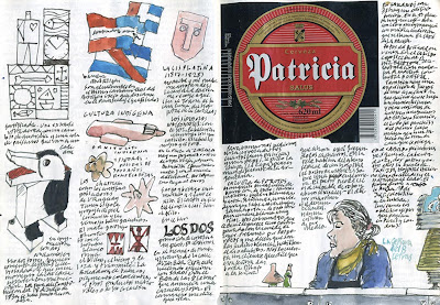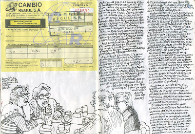 En el Bar Los Dos del mercado comemos sargo, besugo y cazón baratos. En el Bar de las 8 letras una cazuela de porotos con carne, patatas, judías blancas, pasta, guisantes , zanahoria... de todo. Riquísima. Dibujo a la simpática señora. En la tele el Doctor Morelli es culpable de robo y abusos sexuales. En el Café de la Pausa un café con leche rodeados de libros. En el Cabildo fotos del Peñarol y una expo de juegos para el futuro Museo del Juego, donde vemos el primer parchís, el Ludo, un juego sumerio, y otros juegos mayas.