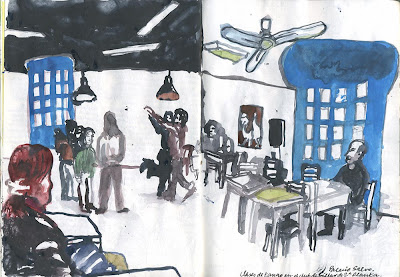 Un abuelo mira nervioso a esa pareja bailar tango. Las mesas de billar están tapadas con plásticos. Se ven relojes y una vitrina llena de trofeos. Al fondo, unos chavales le dan al taco. El profesor explica los movimientos. Nos sentamos en las mesas del bar para oír las clases, la barra está vacía, no se ven camareros. Aunque los dibujo, los tanguistas nos ignoran.