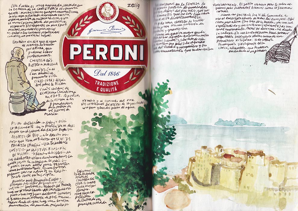 Lungo Mare, el malecón, el tontódromo, y, finalmente, el Castillo del Huevo lleno de restaurantes de pescado y bares de copas romántico-turísticos. Hay una muestra de ilustradores. Llamamos a Simonetta y quedamos para mañana. Volvemos por Via Toledo. El funicular, el Palazzo d'Intendenzza, Piazza Carita con palmitos sin sombra, Dante, Via Portalba con libros de viejo, botellón bajo los pies de Bellini. Ya en nuestra terraza, el camarero me pide el cuaderno para enseñárselo al jefe. Me trae el vaso de leche fría, que bebo mientras dibujo nuestro cuartel general. Aquí descansamos, ponemos en orden nuestras ideas y hacemos planes para el día siguiente. El camarero tiene cara de bobo, solo está pendiente del patrón. Me fumo el último cigarro. El humo revolotea ese montón de imágenes.