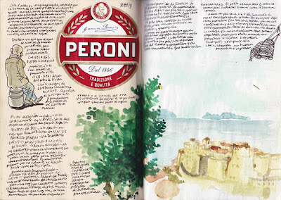 Mientras Beni se toma un café, me voy a Via Comunale a ver el eucalipto abuelo. El tronco, repleto de colores, rebosa de su cauce y revienta la barandilla. Lo dibujo y espero el 140 para ver la tumba de Virgilio. No viene y me empiezan los remordimientos por dejar a Beni sola. Cuando vuelvo, está leyendo en el malecón. Desde Antonio & Antonio dibujo el castelo achaparrado. Se pone a llover. Vemos la expo de ilustradores. Demasiado publicitarios y efectistas y muy poco contenido. Estoy cansado de estas cosas, prefiero ver llover. Encerrados en el huevo de Virgilio. Los perros sueltos bajo el bochorno y el agua cayendo a mares.