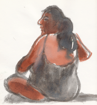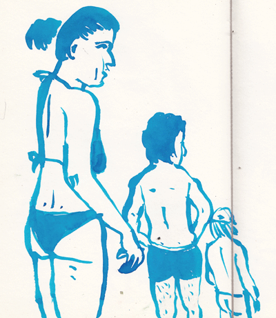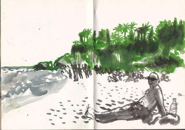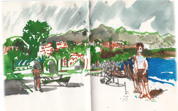 Dibujo a Ángel con sus gafas, a una familia completa y a una gorda que toma el sol y las aguas sentada. Cuando la cosa parece no dar más de sí, subimos al hotel cogiendo trozos de cactus y algún geranio para la huerta.