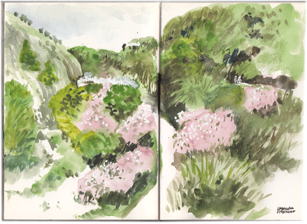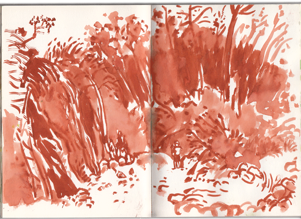 Mientras los compañeros se jalan el bocata, yo aprovecho para dibujar el cortado donde los pinos se agarran milagrosamente. El bacon y los huevos juguetean en mi estómago. Por las prisas uso sólo un pincel de acuarela marrón.