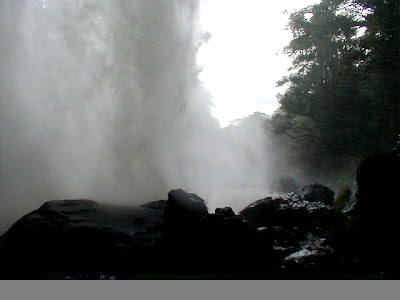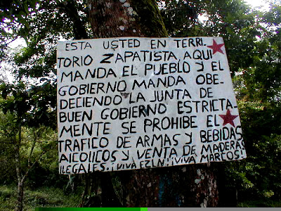 Después vamos a una cascada con un camino en su interior y, después de un café, cogemos otra vez la furgo. Por curvas y curvas llegamos a Aguazul. El río lleva mucho barro, el agua es marrón. Aunque cada vez que caminamos vemos más y más cascadas, no nos gusta tanto barrizal y tanto turista. Todo está lleno de carteles anunciando que estamos en territorio zapatista. Aquí manda el pueblo y el gobierno obecede, reza. Comemos malamente en unas chozas. Tienen tele y muchos mexicanos vienen a verla.