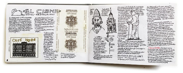 Café con tarta de manzana (recién hecha, buenísima) en el Café Iruña, que dibujo sin demasiado detalle para no echar el día. Pijos de pelo lamido, forasteros y señoras arregladas de domingo.