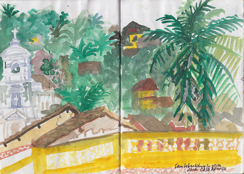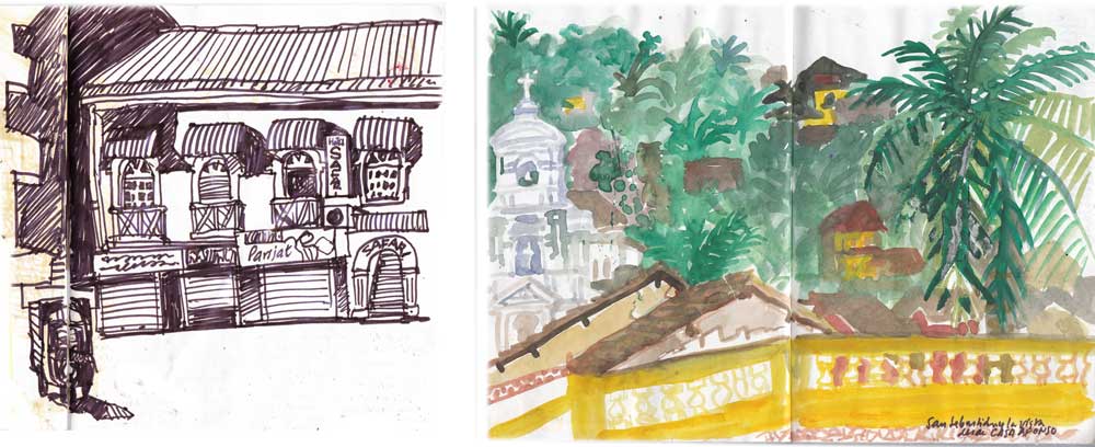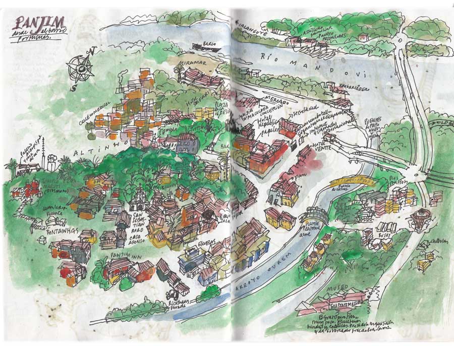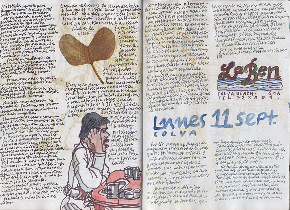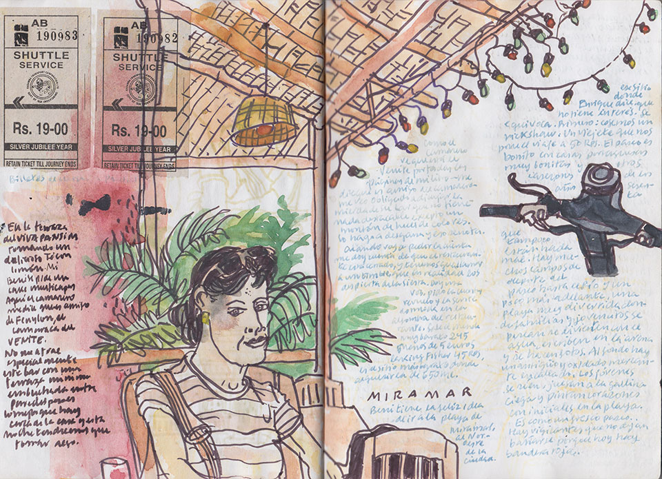 Después de un duro trabajo de los incansables mosquitos sobre mi pálido culo, por fin amanece. Me pongo a dibujar en la terraza hasta que sale el sol. No hay un milímetro de tierra sin que las plantas lo cubran. Se nota que estamos cada vez más relajados. Me paseo por su largísima playa tropical de arena amarillenta y palmeras. Desayunamos con vasos metálicos en el Sagar Kinara mientras ellos almuerzan. Cogemos un bus para Margao y luego Panjim. Casa Afonso, otra vez en el barrio portugués de Fontainhas. Duchas. Comemos en el Viva Panjim, en un callejón cercano. Peixe portuguese y pollo rebozado. Salsa picante para uno y mucho pan para el otro, pues rabia. Compartimos los platos. Cuando vamos a pagar, nos damos cuenta de que estamos solos y el restaurante cerrado. Llamamos a la puerta y doy unas voces. Al rato, se abre la puerta y sale desperezándose un chaval que se había echado a la siesta en la alfombra.