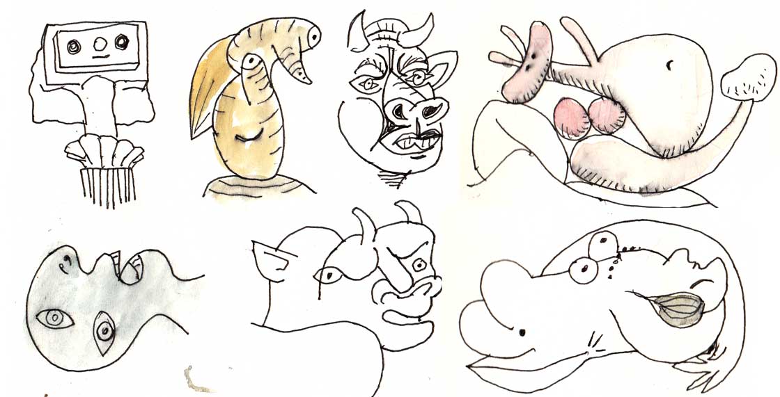 Estos dibujos rápidos a modo de logotipos, sobre su obra expuesta en 2008 en el Reina Sofía, representan algunos de esos encuentros. Muchas formas de representar la figura humana, muchas con verdadera gracia, muchas volumétricas a pesar de ser bidimensionales, capaces de representar ojos, tetas, narices, glúteos y toda suerte de orificios en un sólo plano. Capaces de descomponerlo todo sin perder su esencia.