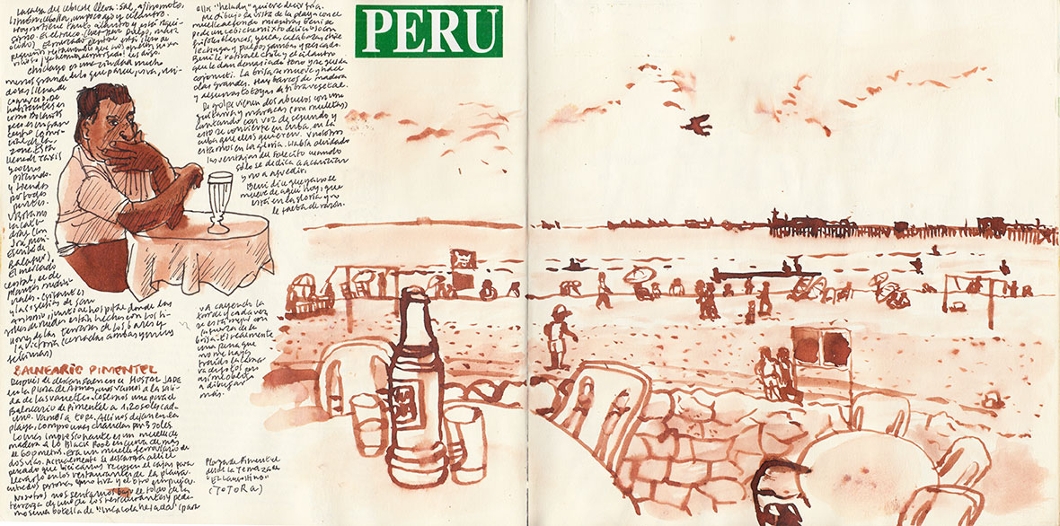 Decidimos dirigir nuestras operaciones desde El Langostino, un chiringuito con terraza a la sombra por la que corre la brisa. Nos pedimos una botella de Inca Cola y un ceviche mixto, al que Beni limpia un poco de coroto y cilantro, y se queda de maravilla. Me pongo a dibujar mientras pincho langostinos, pulpo y pescado (con cebolla morada, yuca, calabaza, maíz y frijoles blancos) y empercudo el cuaderno. En mi línea. Se está tan bien aquí que decidimos quedarnos toda la tarde. Estoy sin cámara y me pongo a dibujar como loco: la playa con el muelle, las barcas de madera y totora, la gente del bar.