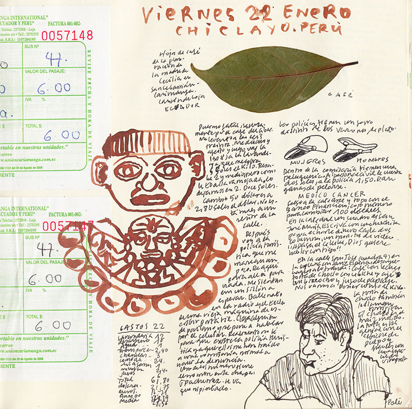 Las camareras son dos chavalas muy simpáticas que se ríen de mis palabras como si fuera un extraterrestre. Les digo que colecciono las tapitas de las botellas y me traen mogollón. Se llaman Rosa y Cintia, y no pasan de los catorce. Me piden un dibujo en un papel cuadriculado y yo les pido maíz tostado de tapa con la segunda Inca Cola helada. Dibujo a un guiri rojo comiendo langostinos con dos putitas gordas y a todos los niños que aparecen vendiendo cigarrillos sueltos, chupa chups, chicles, conchitas, pulseras y collares de semis y barquitas de madera. Mi favorita es Vanesa, guapa y lista como ella sola. A ella le compramos el primer cigarro que nos fumamos en el viaje. No está bueno. Le digo que si puedo devolvérselo.