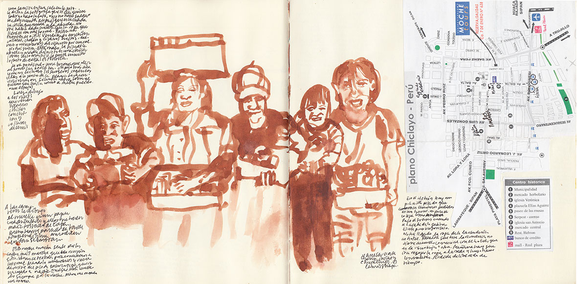 La playa se va llenando poco a poco. La marea está baja y hay una franja inmensa de fina arena. Tan grande, que han colocado restaurantes móviles junto a las sombrillas y hamacas con toldos. En unos de ellos nos instalamos. Bebemos cerveza e Inca cola con unas tortas de choclo y ceviche de tapa. Es una playa popular, divertida, alegre. La gente se tapa con la arena para hacerse fotos. Llegan barcos con pescado, y se amontonan a comprar. Entran las/los bicicarros y cargan. Nuestra mesera me dispensa Hamilton por unidad, mientras dibujo la familia al completo y a algunos clientes. Hay peruanos de todas las edades y gringos de muy pocas. También hay carritos de helados y marcianos, niños vendiendo chuches y figuras horrorosas hechas con conchas, y algún brasilla peruano de esos que vienen de los USA y ahora viven al lado de los famosos y todos los días van a un concierto en Florida. Insoportable la clase media peruana con aires de grandeza. La clase alta, ni la hemos visto.