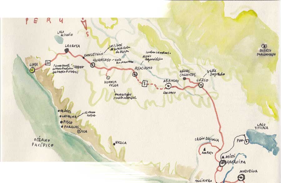 Otra vez a Perú. Esta vez pretendemos ir por el Altiplano Central a Cuzco, bajar a la zona de los cañones, Visitar a Miguel y bajar a Chile. Hago un plano de la posible ruta que, seguramente, las lluvias modificarán. Lo único seguro es que hoy nos vamos a Lima y que intentaremos pasar la noche en Barranco, junto al Océano Pacífico, arriba de los acantilados. Cenarnos unos anticuchos o ceviche y luego oír las olas mover las piedras junto al Puente de los Suspiros.