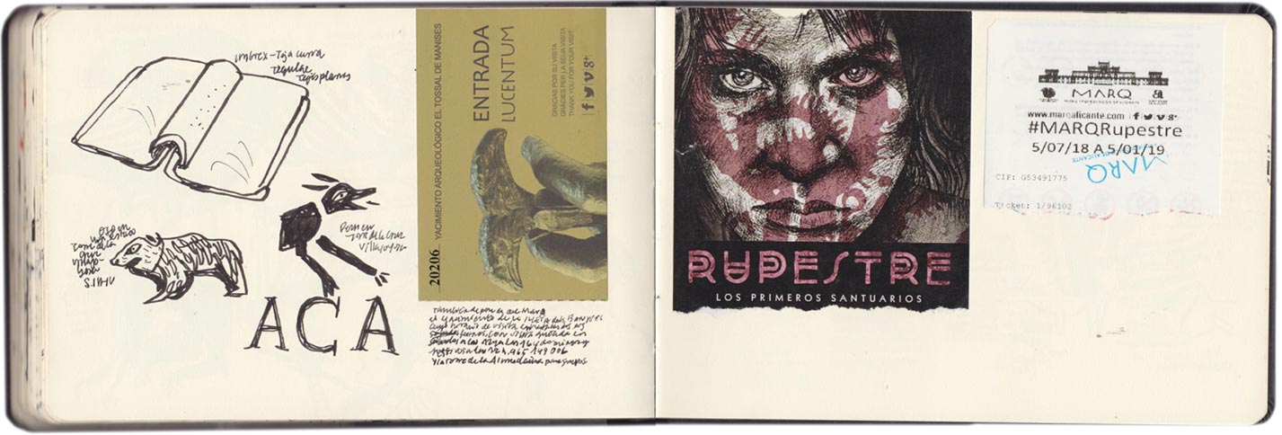 Bajando la Rambla, vemos el Museo de las Hogueras, con los ninots indultats. No me gusta ese realismo paleto de los antiguos, ni la onda disney de los últimos; pero sí la mayoría de los carteles de las fiestas de San Juan. La Explanada, el edificio Carbonell, la Calle Mayor, la Plaza del Ayuntamiento, donde hoy bailan zumba, y una cerveza en la tranquila Plaza del Puente, en la terraza del Pont, de camarero simpático, donde dibujo las vistas del Benacantil, el castillo y la cara del moro. Alguien ven en las rocas y las sierras siempre un moro (por la nariz aguileña, o por eso que parece un turbante), generalmente tumbado a la siesta. Vemos los pozos de Garrigós, tres cisternas excavadas en la roca en el siglo XIX, en la base del Benacantil, para recoger el agua de la lluvia. Al bajar las escaleras saludamos a la señora que colgaba la ropa y ahora está leyendo un libro.