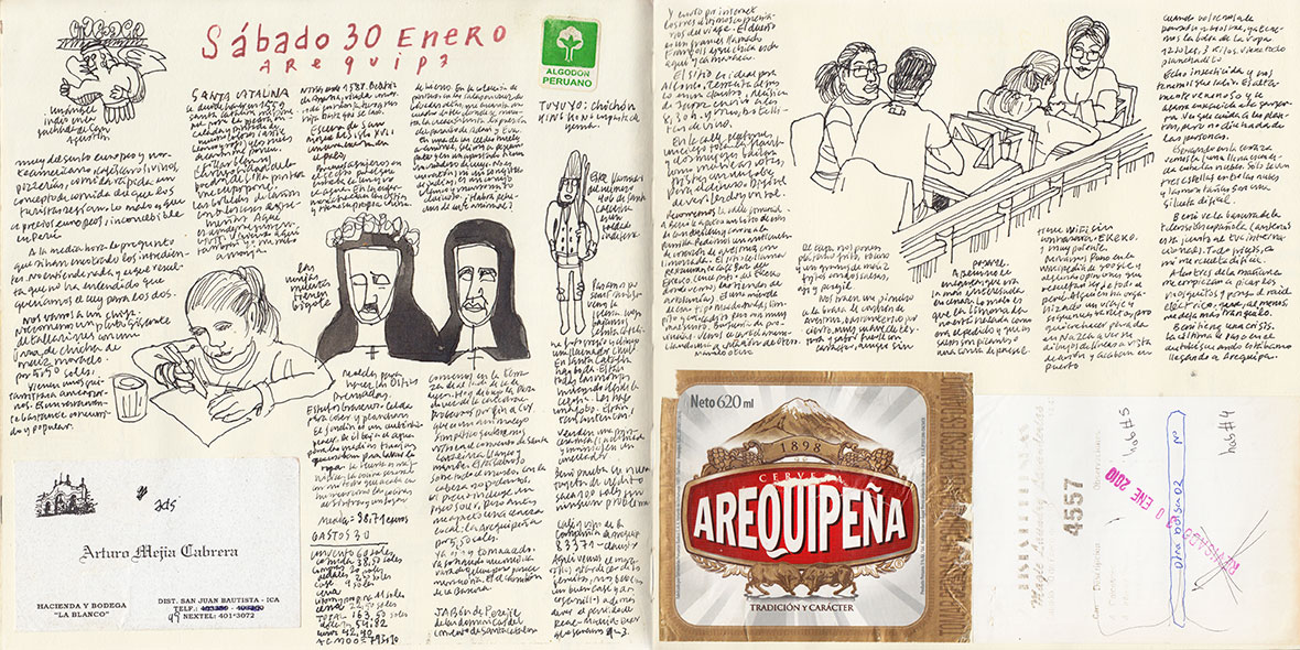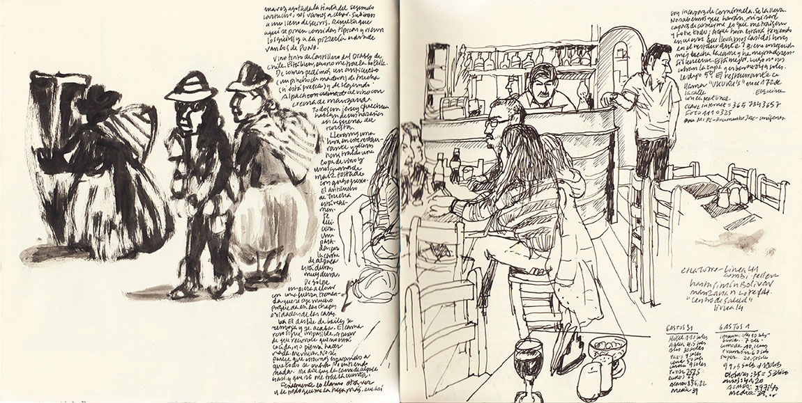 Seguidamente rebobinamos en autobús. Todos los alrededores del lago, Puno (por fin dibujo las fabulosas esculturas indígenas de su portada sintiendo la pérdida en el trasvase a las dos dimensiones), el espectacular altiplano. Tiramos tanto de la cinta, que salta y se malogran los cachitos de hierro y cromo. A la una de la mañana estamos atascados en mitad del desierto. Afortunadamente hemos comprado boletos de Cruz del Sur, con dos buenas camas para olvidar todo y dormir sin piedad.