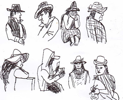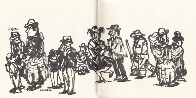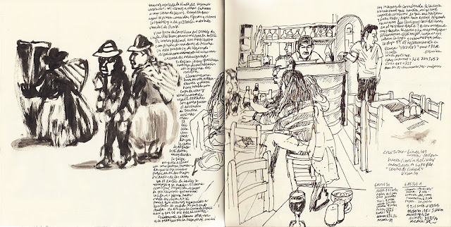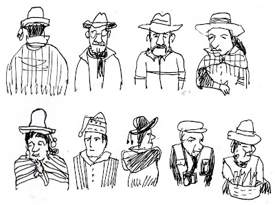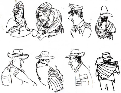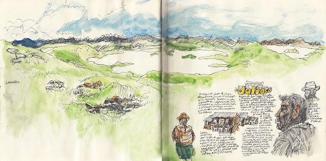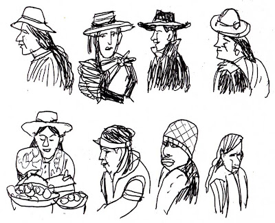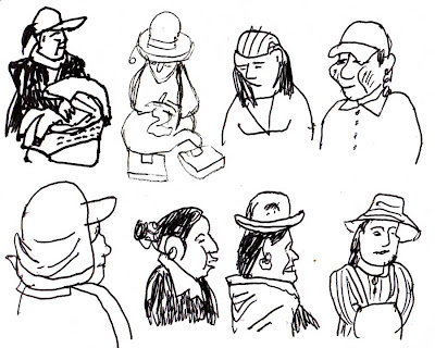 Dibujo a la gente por la calle, por los mercados. Unos sonríen, otras se tapan la cara con las manos. Unos me dan permiso y otros no (pues no los dibujo). La lectora del mercado se gusta y hace que se dejen las demás. En general buen rollo. Veo que el mundo lo llevan las mujeres. Ellas van a vender al mercado con los niños a cuestas y, allí, hacen punto. Ellas van a hacer gestiones, cargan la leña, trabajan en el campo y hasta le lavan el coche al chulo ese.