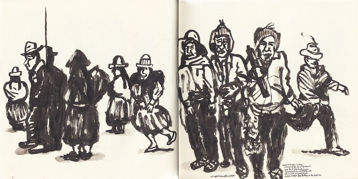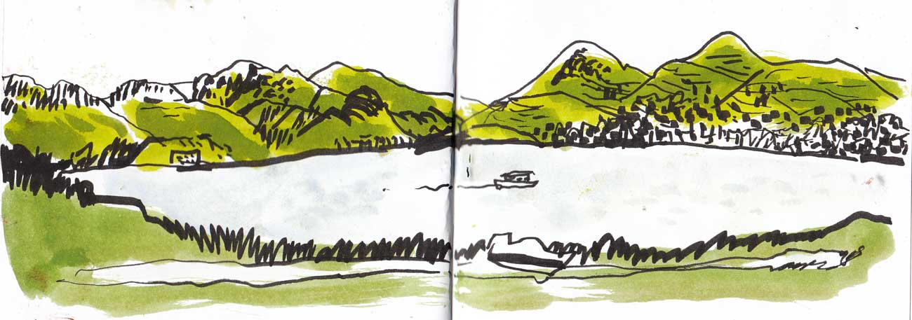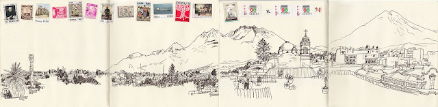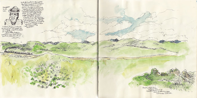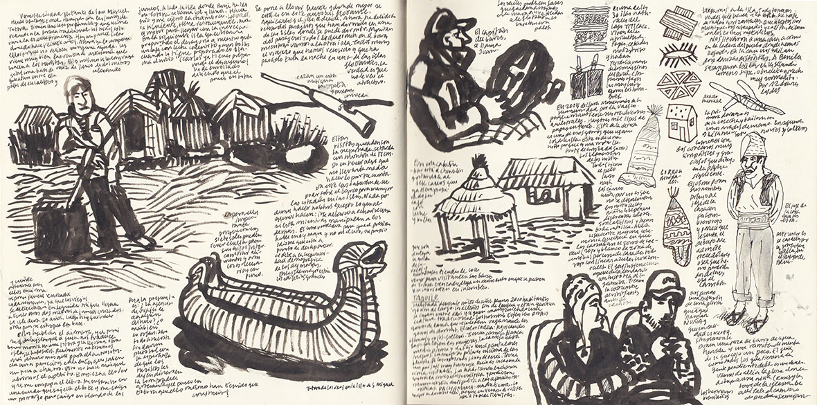 De golpe un lago inmenso que ellos modestamente llaman Lagunillas, y que yo creía ya el Titicaca. Nervioso, me pongo a dibujar. Al fondo y lejos, picos nevados en cadena. Pasado el lago, el valle Taya con su pequeño río, un valle plano que acaba en Cabanillas. Un campo verde y con muchas flores amarillas lleno de casitas de barro con techo de metal brillante. Una bajada y el lago Titicaca, impresionante, y Puno ahí abajo. Casas como sin terminar, de ladrillo sin enfoscar y con los hierros sueltos del encofrado, para algún día hacer una segunda planta. Nunca. Las casas bajan por las laderas de las montañas hasta amontonarse a la orilla del lago.