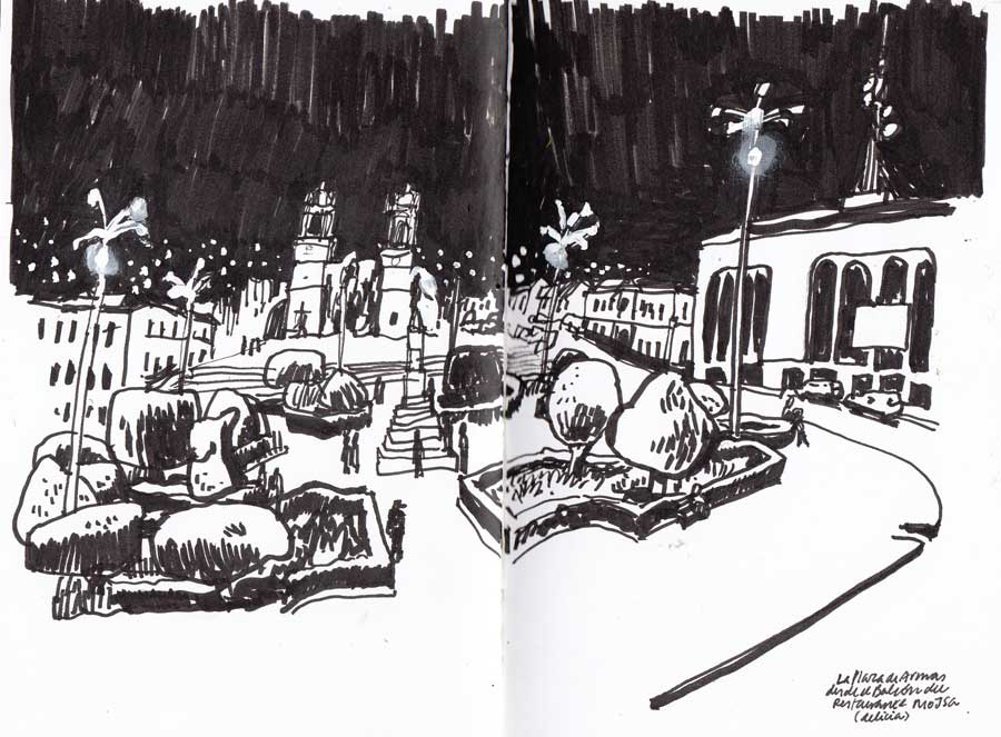 Se nos escapó el rocoto relleno arequipeño, ahora lo pedimos en el Mojsa (delicia en aymara), en la Plaza de Armas, un restaurante pijo para guiris que tiene un balcón a la plaza y calefacción. Nos comemos un pimiento cada uno (muy picante, se hierve tres veces para rebajarlo), riquísimo relleno de queso fundido, carne y aceitunas picadas y después me dibujo la plaza con sus árboles recortados de aquella manera.