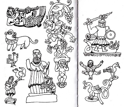Paseo mañanero a la Catedral. Magnífica fachada con preciosas esculturas de gusto y manufactura indígena: sirenas tocando el laúd, músicos pajarillos y San Miguel matando un diablo con alas y la espalda retorcida. ¿De dónde sacó el diablito? me pregunta una señora de bombín fisgoneando en mi dibujo.