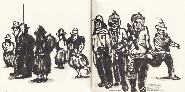 En Puno son las fiestas de la Candelaria, el día 2, que consiten en dos semanas de danza y bebida. Se juntan las agrupaciones de unos 600 departamentos de la provincia con sus trajes, gorritos, canciones y danzas diferentes. Es un desfile folclórico. Los tíos están cada vez más tomados. Cojo el pincel y me pongo a dibujar a toda leche. La gente se maravilla de mi rapidez y me considera un artista de esos que hacen retratos por las calles. Posan para ser dibujados. Un pintor local queda con nosotros para enseñarnos sus obras y una televisión local me hace una entrevista. ¡Esto es lo más loco e indígena que hemos visto!