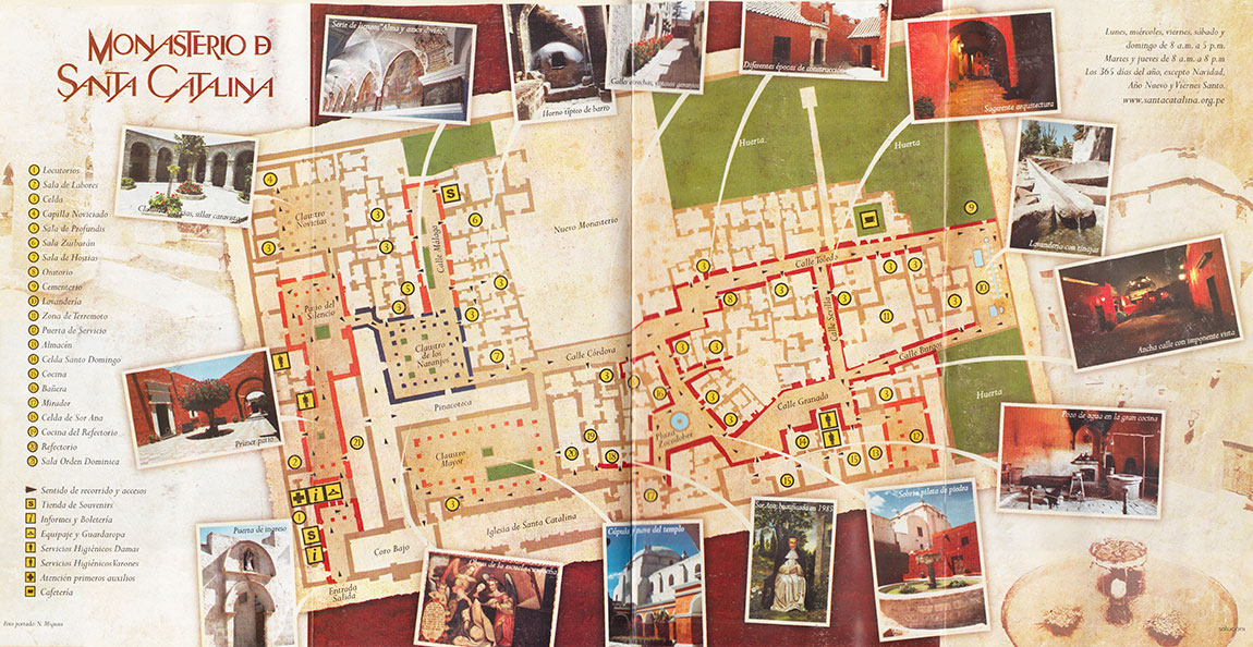 Después de un buen desayuno en la terraza, dedicamos la mañana al convento de Santa Catalina. Si venís, no os asustéis por el precio, lo merece. Estas monjas de clausura, hijas y viudas de ricos, se había montado toda una ciudad tranquila llena huertas y geráneos. Una verdadera maravilla, dan ganas de coger los hábitos. Estancias abobedadas encaladas en nuestros colores añil, rojo y blanco. Todo de piedra de sillería y todo lleno de macetas. Pequeñas calles, patios, huertos, celdas con fogones de piedra y pequeños patios. Una granjita de cuyes. Retratos de las monjas muertas con un buen mostacho.