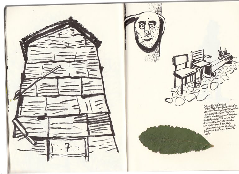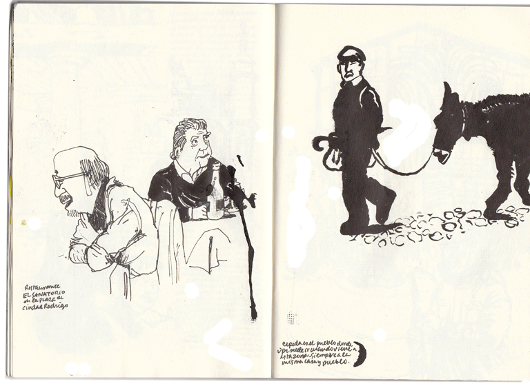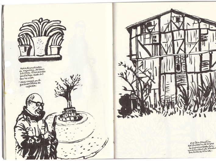 Hoy tenemos demasiado coche y pocas paradas. Decido dibujar rápidamente sólo algunos detalles que no me lleven tiempo. Visitamos San Martín del Castañar. Plaza del Pilón y cuidador de bonsais. El portalón. Chapas oxidadas para la lluvia en las casas. Figuras de los dinteles Niebla en la Peña de Francia sin vistas. Finalmente Ciudad Rodrigo. Comida en El Sanatorio. Morros de ternera rebozados y revuelto de farinato, huevos y patatas. Casas señoriales con piedras amarillas e impactos de artillería. Una siesta en el coche y noche en Bolaños.